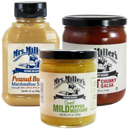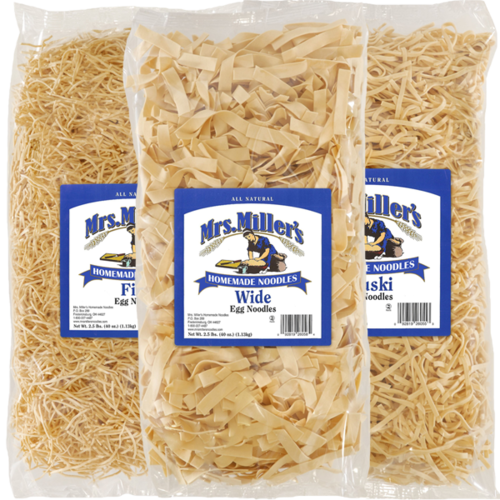 Making noodles the old fashioned way since we started in 1973. We’re committed to bringing you quality products and friendly service. Shop Mrs Miller’s Homemade Noodles products below and taste for yourself the Mrs. Miller’s difference. Made with extra fancy durum wheat flour and farm fresh eggs, this variety of all natural egg noodles provides a hearty homemade taste. Both delicious and healthy, our Vegetable Noodles are made with extra fancy durum wheat flour, all natural vegetable powders, and egg whites. Cholesterol free. Whole grains provide more fiber, and these all natural, whole grain homemade pastas are made with egg whites only so they are cholesterol free. Made with extra fancy durum wheat flour, but by using only the whites of farm fresh eggs, the cholesterol has been eliminated from these all natural noodles. Always have Mrs. Miller’s all natural noodles on hand with our convenient bulk sized bags. Experience the goodness of Mrs. Miller’s all natural noodles made with the finest certified Organic ingredients. Our soup base is of the highest quality. On top of the rich flavor; all of our soup bases are gluten free, and contain no added MSG. They are the perfect partner to our homemade noodles. All of Mrs. Miller’s homemade pasta sauces contain the freshest ingredients, from vegetables to spices. Mrs. Miller knows you will find her old fashioned pasta sauces to be the perfect addition to any casserole or pasta dish. Some of Mrs. Miller’s absolute favorites, these homemade goodies can turn a meal or snack into a wonderful experience. Mrs. Miller’s Gift Boxes are perfect for any occasion! Buy one for your home or give one to a friend. Perfect for trying new sizes or flavors. Shop Mrs Miller’s Homemade Noodles